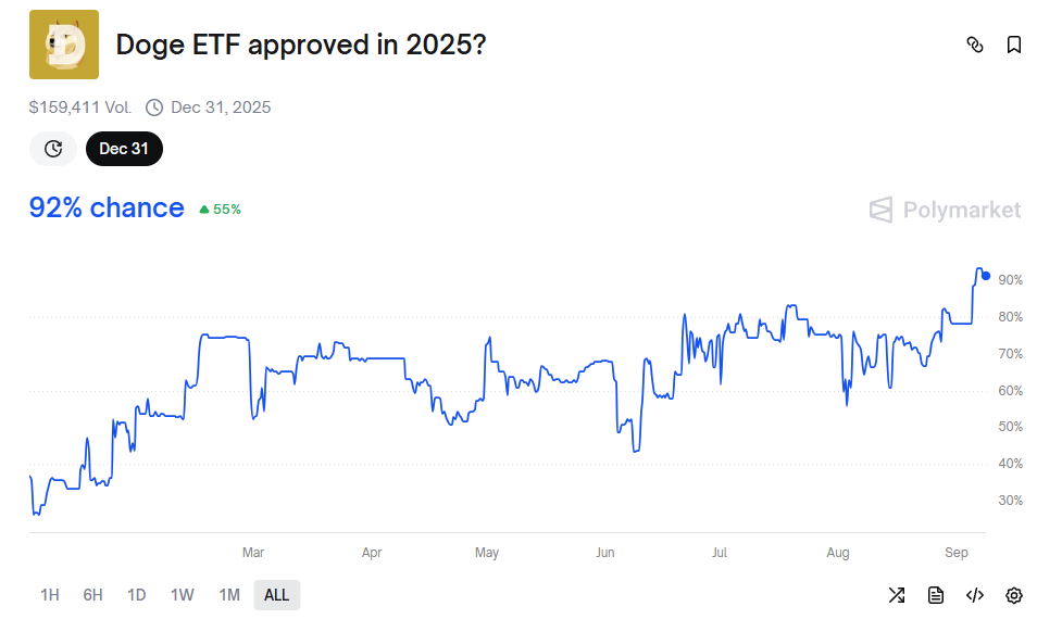Еще один важный фактор, поддерживающий приток капитала в сентябре, — это ожидания инвесторов по поводу утверждения ETF на DOGE. Рынок предсказаний Polymarket показывает, что к сентябрю вероятность утверждения ETF на DOGE достигла нового максимума — более 90%, что является самым высоким уровнем в этом году.