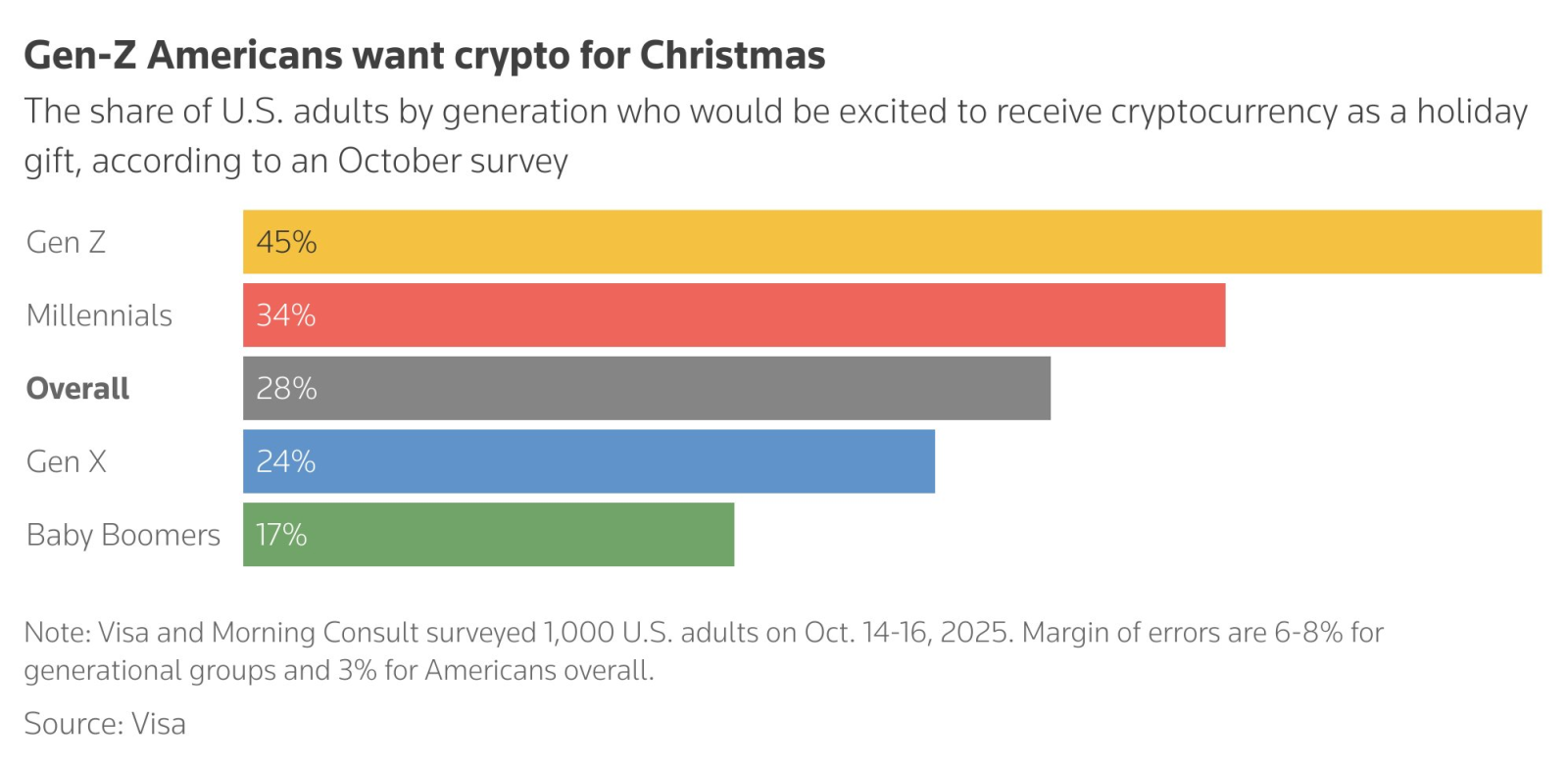 По данным декабрьского опроса Visa, 28% американцев хотели бы получить криптовалюту в подарок на праздники или Рождество. В поколении Z этот показатель выше — 45%.