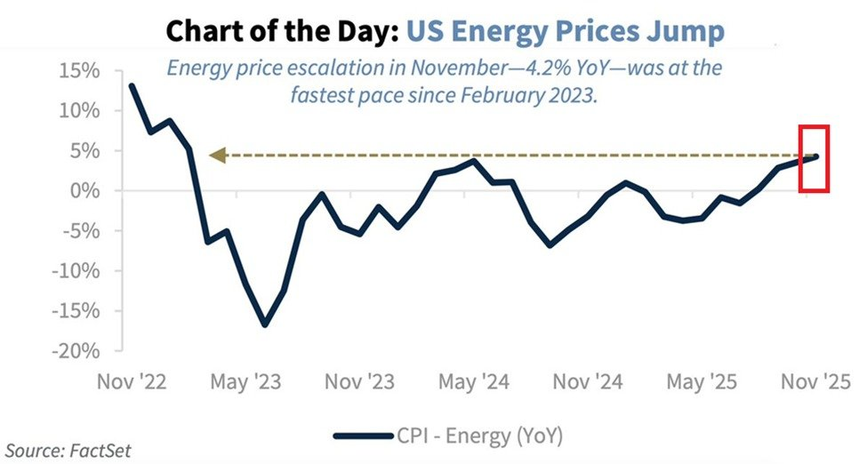 График показывает, что годовой индекс цен на энергоресурсы в США резко вырос в ноябре примерно до +4,2%, достигнув максимального темпа роста с февраля 2023 года.
