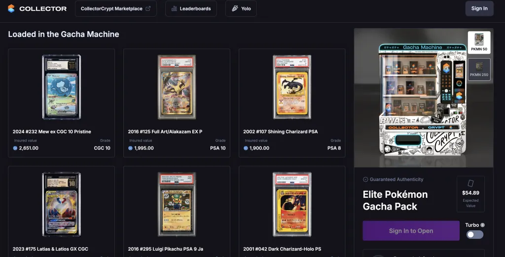 Самым популярным продуктом Collector Crypt стала цифровая гача, напоминающая лутбоксы в видеоиграх. Пользователи получают случайный NFT, который может быть привязан к «легендарной» карте Pokemon.