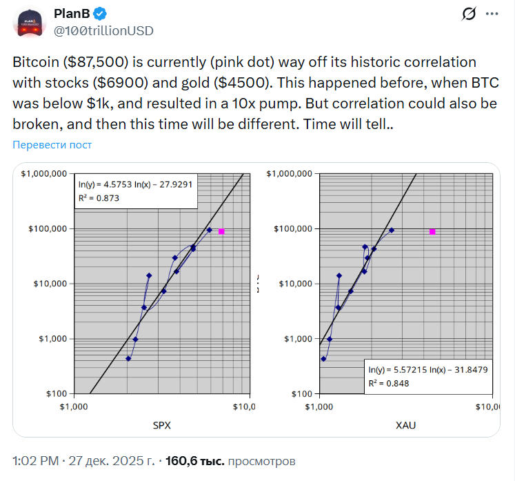 Популярный инвестор под псевдонимом PlanB обратил внимание на уникальную ситуацию. Он отмечает, что курс цифрового золота сильно отклонился от своей исторической корреляции с акциями ($6900) и золотом ($4500).