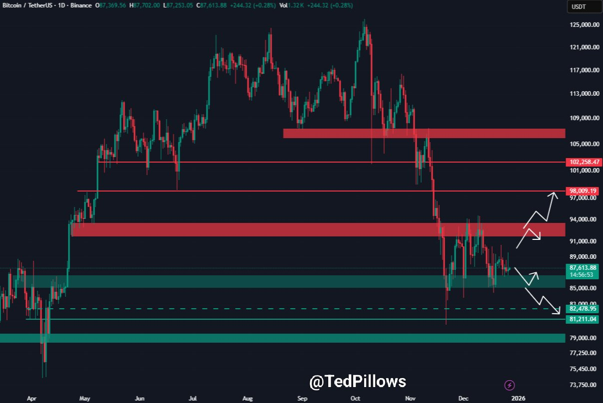 Пиллоуз ожидает четкого сигнала о направлении, который появится только после одного из двух событий: либо биткоин закрепится выше зоны $90 000, либо повторно протестирует уровень поддержки в диапазоне $84 000-85 000.