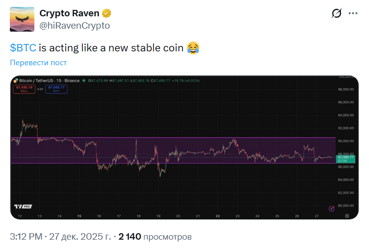 Пользователь Crypto Raven пошутил, назвав биткоин «новым стейблкоином». По мнению эксперта, первая криптовалюта демонстрирует необычайно низкую волатильность для основного криптоактива.