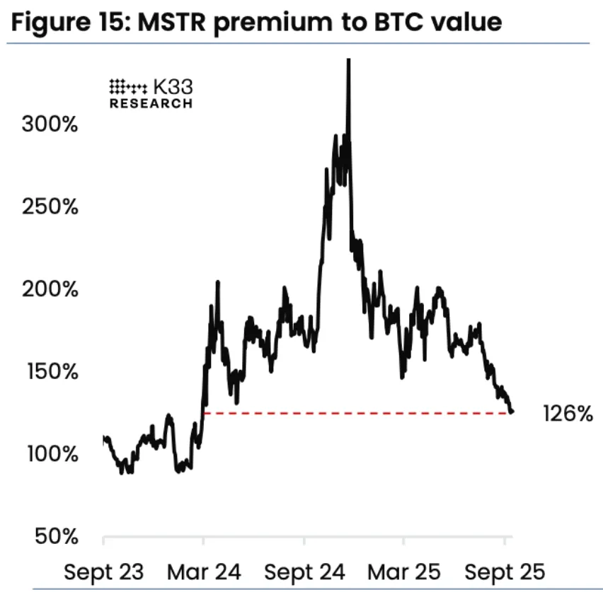 Согласно K33, премия акций организации Майкла Сэйлора показала самый низкий результат с марта 2024 года и составила 1,26.