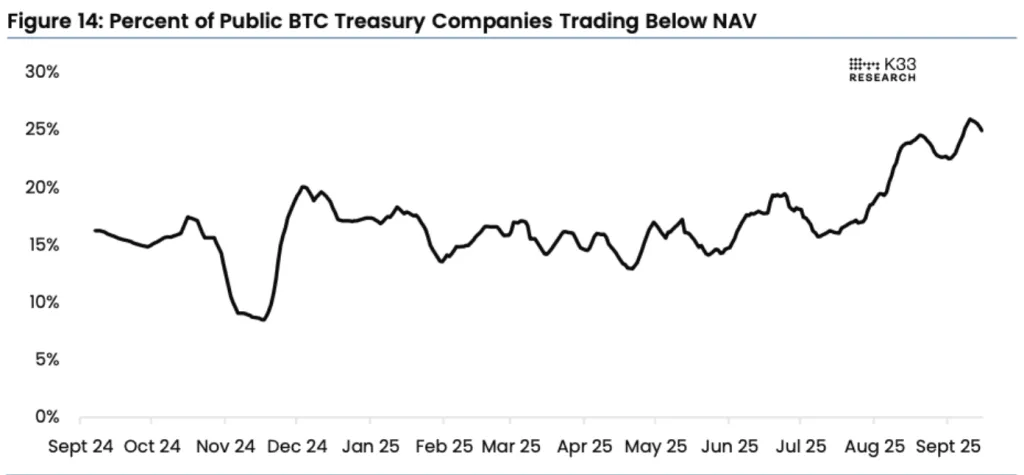 Согласно сентябрьскому отчету K33, наблюдается значительное падение стоимости публичных компаний с биткоином на балансе. Каждая четвертая организация торгуется с рыночной капитализацией ниже стоимости принадлежащих им цифровых активов.