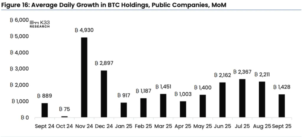 По данным отчета, темп накопления первой криптовалюты также замедлился. В сентябре криптоказначейские фирмы добавляли всего 1428 BTC в день, что является самым слабым показателем с мая.