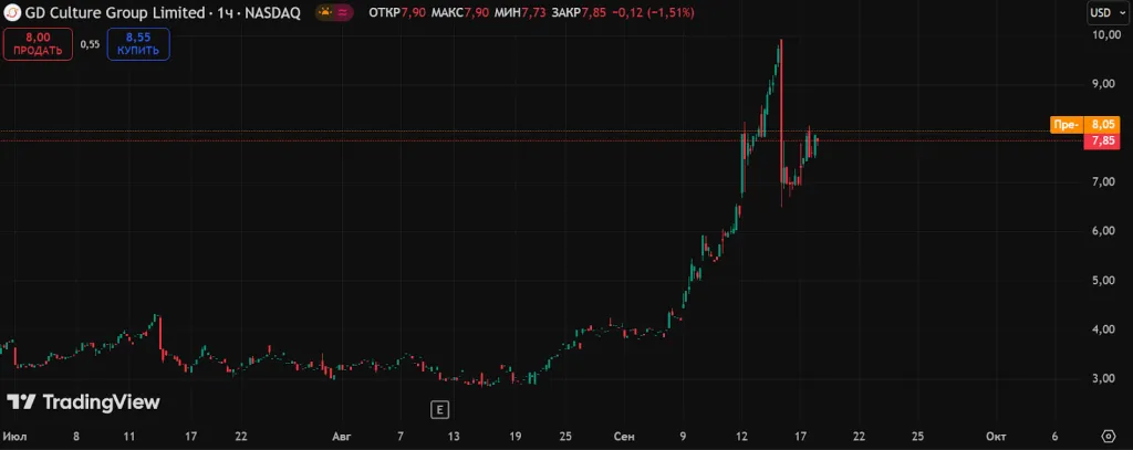 16 сентября GD Culture Group, занимающаяся стримингом и электронной коммерцией, столкнулась с падением стоимости акций. После объявления о приобретении 7500 биткоинов у Pallas Capital Holding на $875 млн их цена снизилась на 28%. На момент написания GDC восстанавливается.