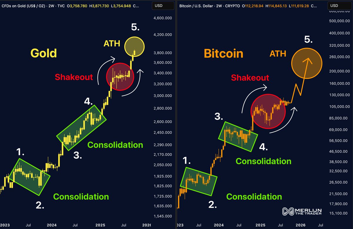 Трейдер Merlijn заявил, что биткоин все еще «следует сценарию золота». «Золото: встряска перед историческим максимумом. Биткоин: та же консолидация, та же ловушка. Пробой запрограммирован. Следующая остановка — режим обнаружения справедливой цены», — написал он в соцсети X.