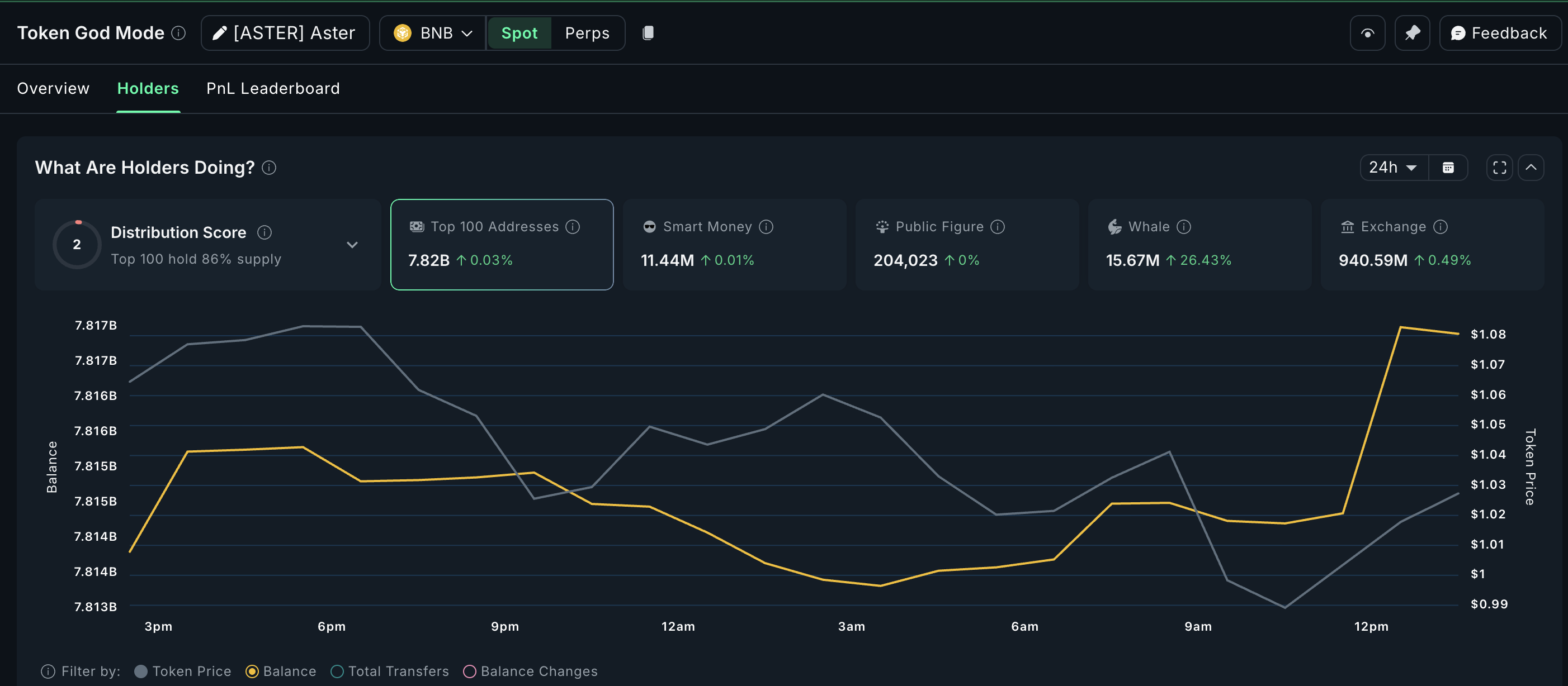 За последние 24 часа крупные держатели нарастили позиции на 26,4%, увеличив общий объем до 15,67 млн ASTER. Это плюс 3,27 млн токенов на сумму около 3,33 млн долларов. Такой рост интереса демонстрирует уверенность крупных игроков, делая ASTER одним из явных фаворитов среди покупок китов после решения ФРС.