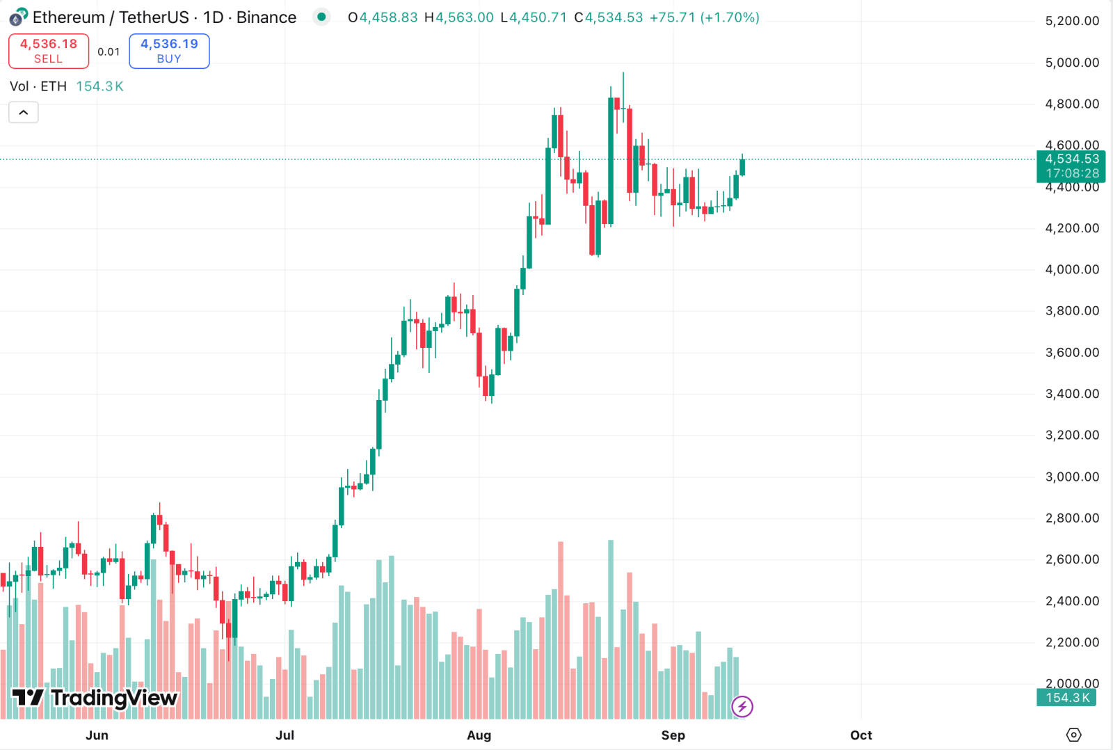 Сейчас монета торгуется по $4534, тогда как аналитики указывали на период консолидации возле уровня $4400.