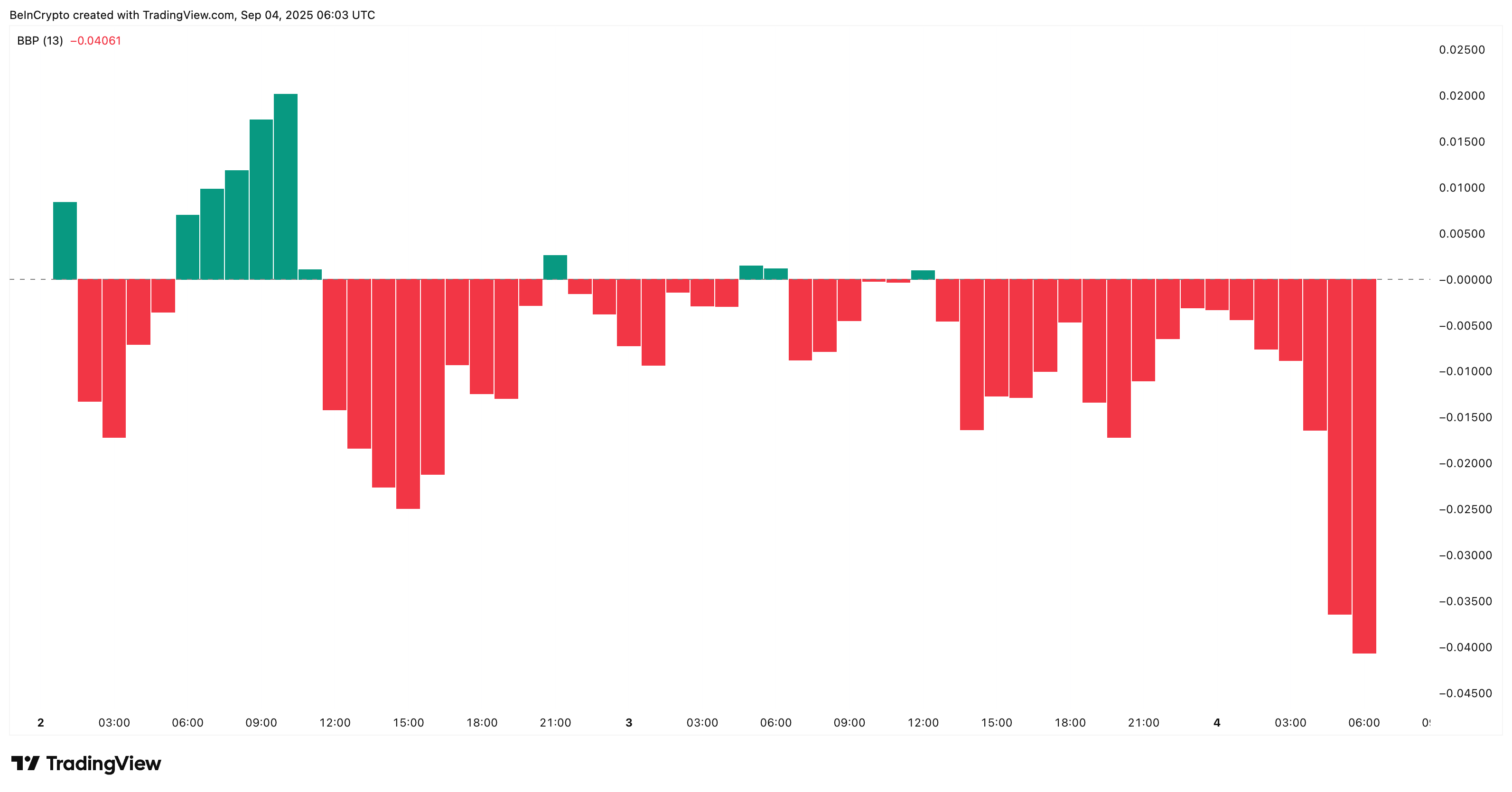 Индикатор Bull–Bear Power (BBP) подтверждает дисбаланс. BBP сравнивает экстремумы цен со скользящей средней, чтобы показать, кто контролирует импульс — быки или медведи. На часовом графике, который наиболее актуален для WLFI, гистограмма глубоко в красной зоне. Проще говоря, медведи диктуют тренд, и покупатели пока не смогли организовать устойчивую защиту.