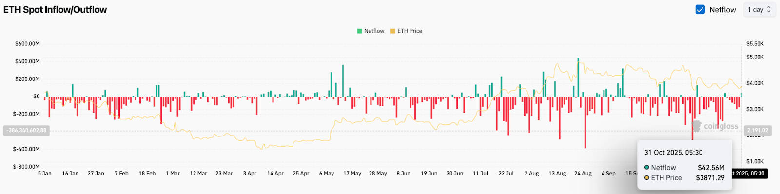 Более широкие перспективы Ethereum зависят от того, возобновится ли приток средств в продукты ETF и стабилизируются ли макроэкономические настроения в начале ноября. До этого момента трейдерам следует следить за объёмом в районе $3800–$4000, чтобы получить подсказки о следующем направлении движения.