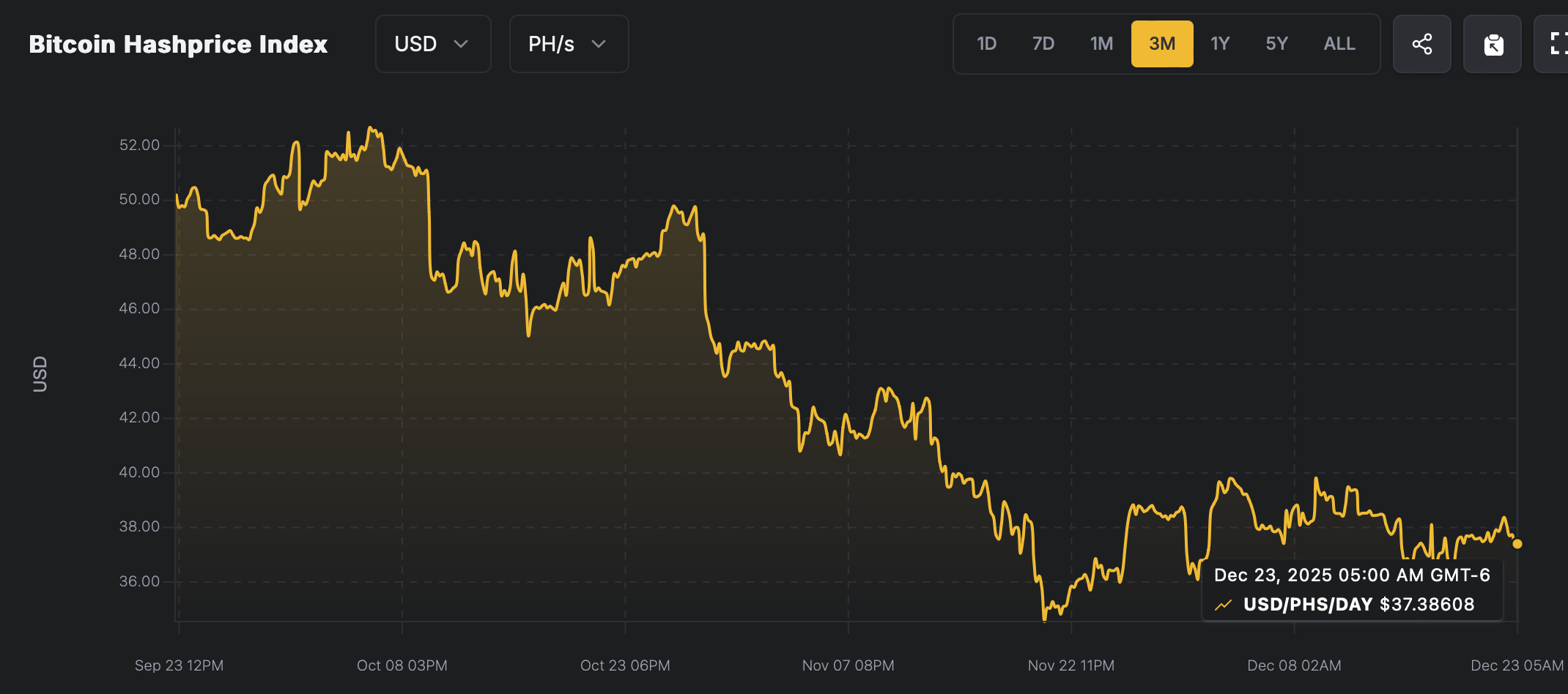 Цена хешрейта при майнинге биткоина — ключевой показатель выручки майнера за единицу вычислительной мощности — с середины ноября держится ниже $40. Многие операторы считают этот уровень точкой безубыточности. Спад вынуждает компании пересматривать свои операционные модели, поскольку рентабельность в отрасли остается под давлением.