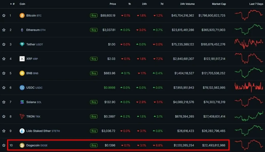 DOGE торгуется вблизи отметки $0,14, удерживаясь в топ-10 по рыночной стоимости с показателем около $22,5 млрд.