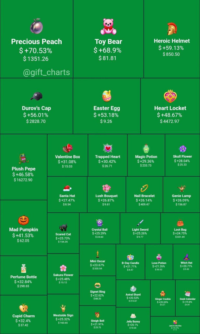 Самыми дорогими стали токены из коллекций Durov’s Cap («Кепка Дурова»), Heart Locket («Медальон-сердце») и Plush Pepe («Плюшевый Пепе»). Средняя цена за токен из коллекции составила $2,8 тыс., $4,4 тыс. и $16,2 тыс. соответственно. Эти серии за 30 дней подорожали на 46–56%.
