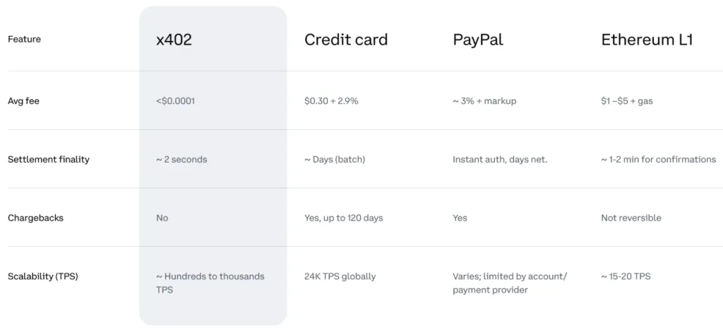 Сравнение x402 с другими платежными решениями в контексте комиссий, скорости финализации и прочих параметров. Источник: Coinbase.
