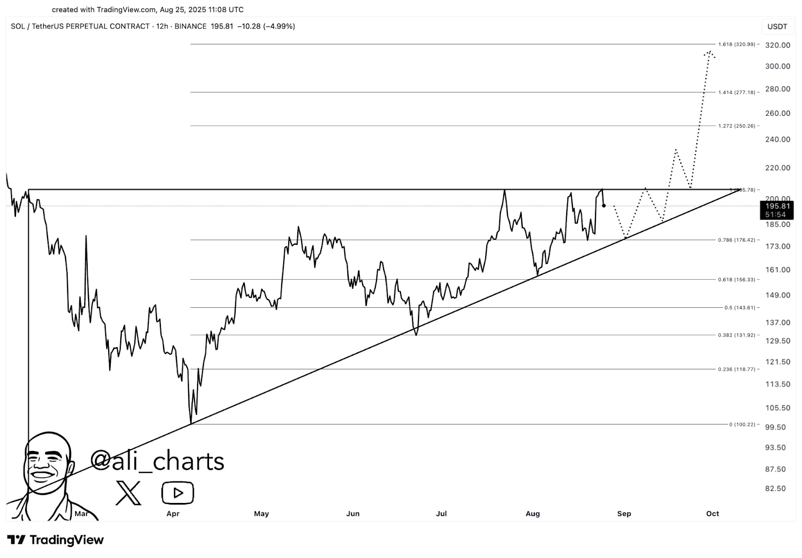 Криптоаналитик Али Мартинес отметил, что последний отказ Solana является результатом колебаний рынка вокруг отметки в $200.