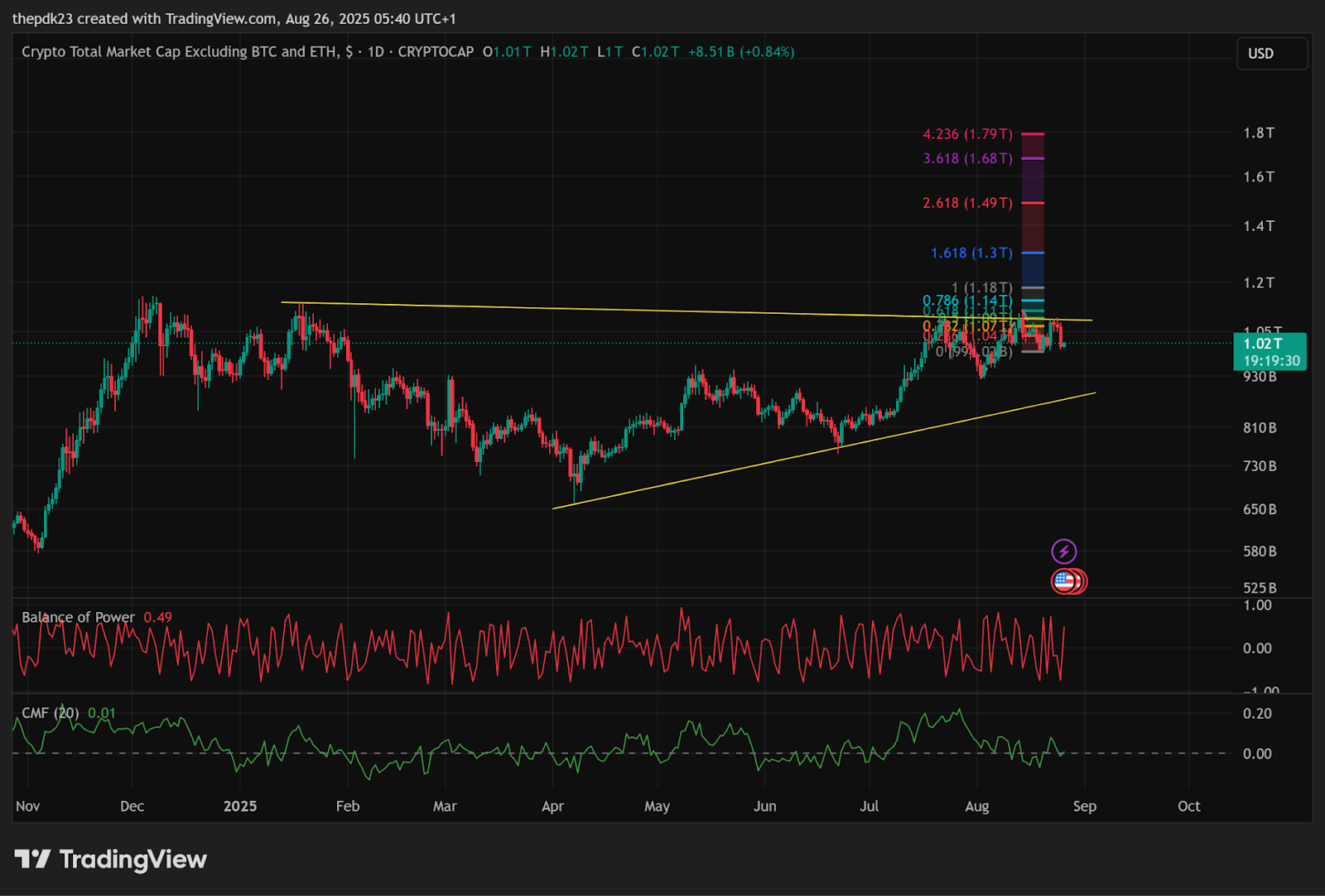Если TOTAL3 сможет уверенно превысить отметку в 1,05 трлн долларов, расширения Фибоначчи указывают на потенциальные траектории движения к 1,3 трлн долларов (1,618), 1,49 трлн долларов (2,618) и даже 1,68 трлн долларов (3,618). Эти уровни ознаменуют начало настоящего «сезона альткоинов».