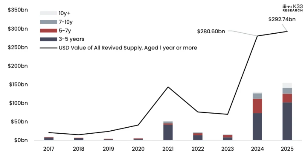 Если взять сумму биткоинов в долларовом выражении, по данным K33, то 2025 года стал рекордным по объему продаж монет, до этого бездействующих более 1 года и более 3 лет. Так, например, сумма BTC с «возрастом» от одного года, перемещенных в этом году приблизилась к $300 млрд. В 2024 году этот показатель составил $280 млрд, в 2017 году — менее $150 млрд.