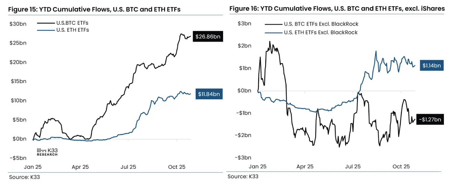 Несмотря на то, что остановка работы правительства США, похоже, завершается, и S&P, и золото демонстрируют сильный рост, биткоин-ETF не увидели спроса вчера», — заявил основатель Capriole Investments Чарльз Эдвардс.