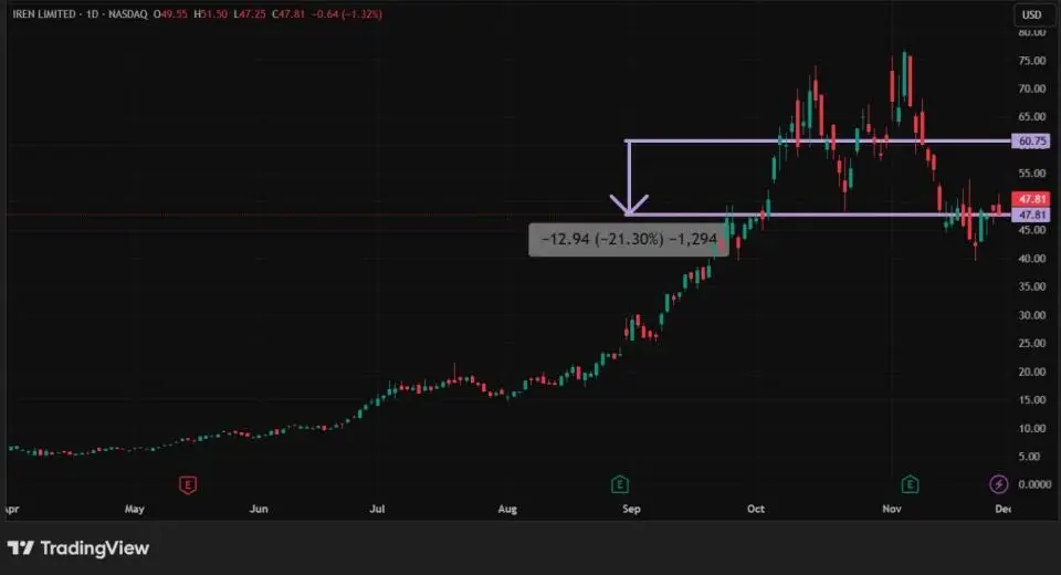 Еще один майнер IREN (бывшая Iris Energy) расположился на седьмой строчке с рыночной капитализацией $13,55 млрд. Его акции снизились в ноябре 2025 года на 21,3%, хотя в начале месяца они обновили свой исторический максимум, достигнув $76,87. Основной фактор падения акций — общее снижение ценных бумаг в секторе развития искусственного интеллекта, куда относится и IREN. Не помог даже контракт на $9,7 млрд, который компания заключила с Microsoft в начале месяца. В соответствии с ним, последняя получит доступ к графическим процессорам Nvidia GB 300, которые IREN планирует развернуть в своем кампусе в Техасе в 2026 году.