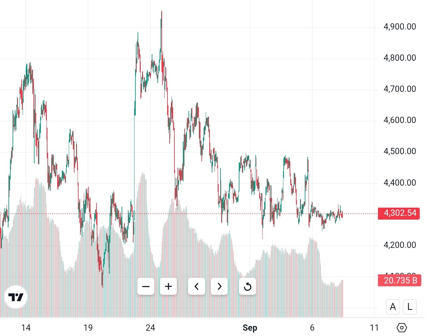 На момент написания обзора, криптовалюта торгуется по $4 302, что на 13% ниже абсолютного максимума.
