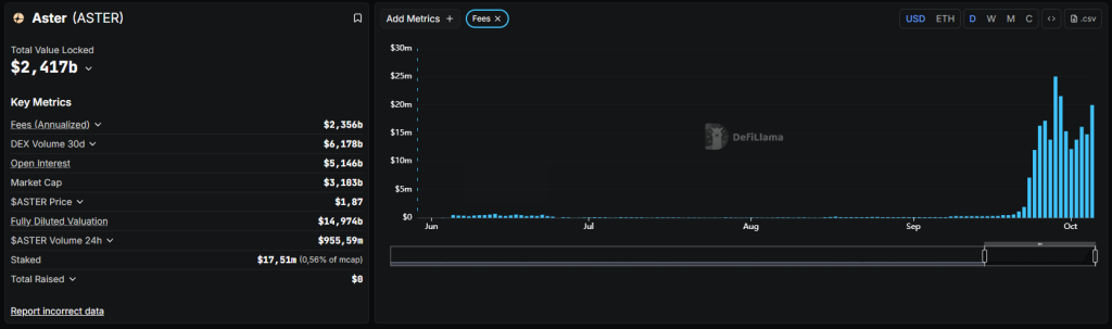 Платформа также заняла верхние строчки в рейтинге протоколов по объему комиссий. 28 сентября показатель Aster превысил $29 млн против $22 млн и $7 млн у Tether и Circle соответственно.