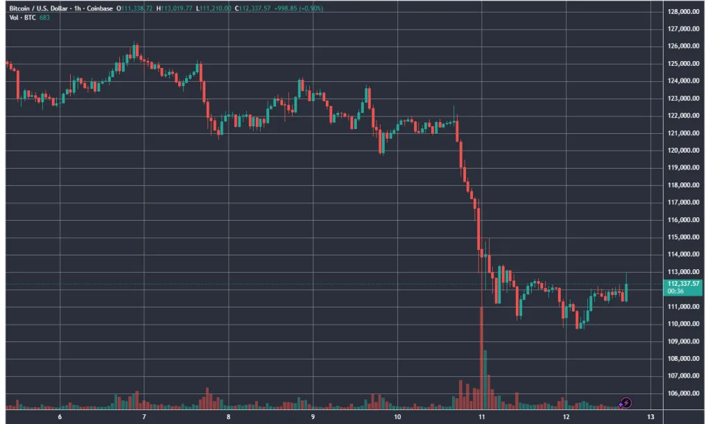 Согласно CoinGecko, локальный минимум криптовалюта зафиксировала 12 октября на отметке ~$101 800. К вечеру воскресенья котировки стабилизировались и восстановились до уровней выше $112 500.
