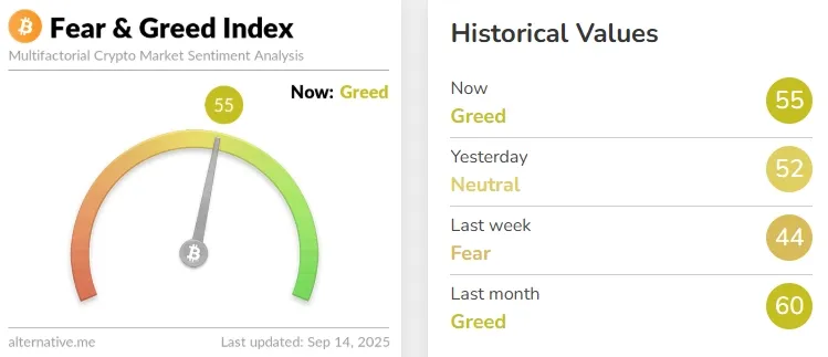 Криптовалютный индекс страха и жадности поднялся из нейтральной зоны до значения 55, сигнализируя об «умеренной жадности».
