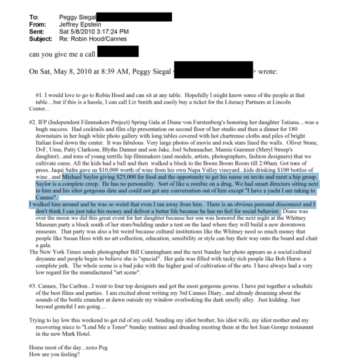 «Майкл Сэйлор дал $25 000 на еду для возможности попасть в список приглашенных и познакомиться с модной компанией. Сэйлор — настоящий жуткий тип. У него нет никакой индивидуальности. Он как зомби под наркотиками», — говорится в письме к Эпштейну.