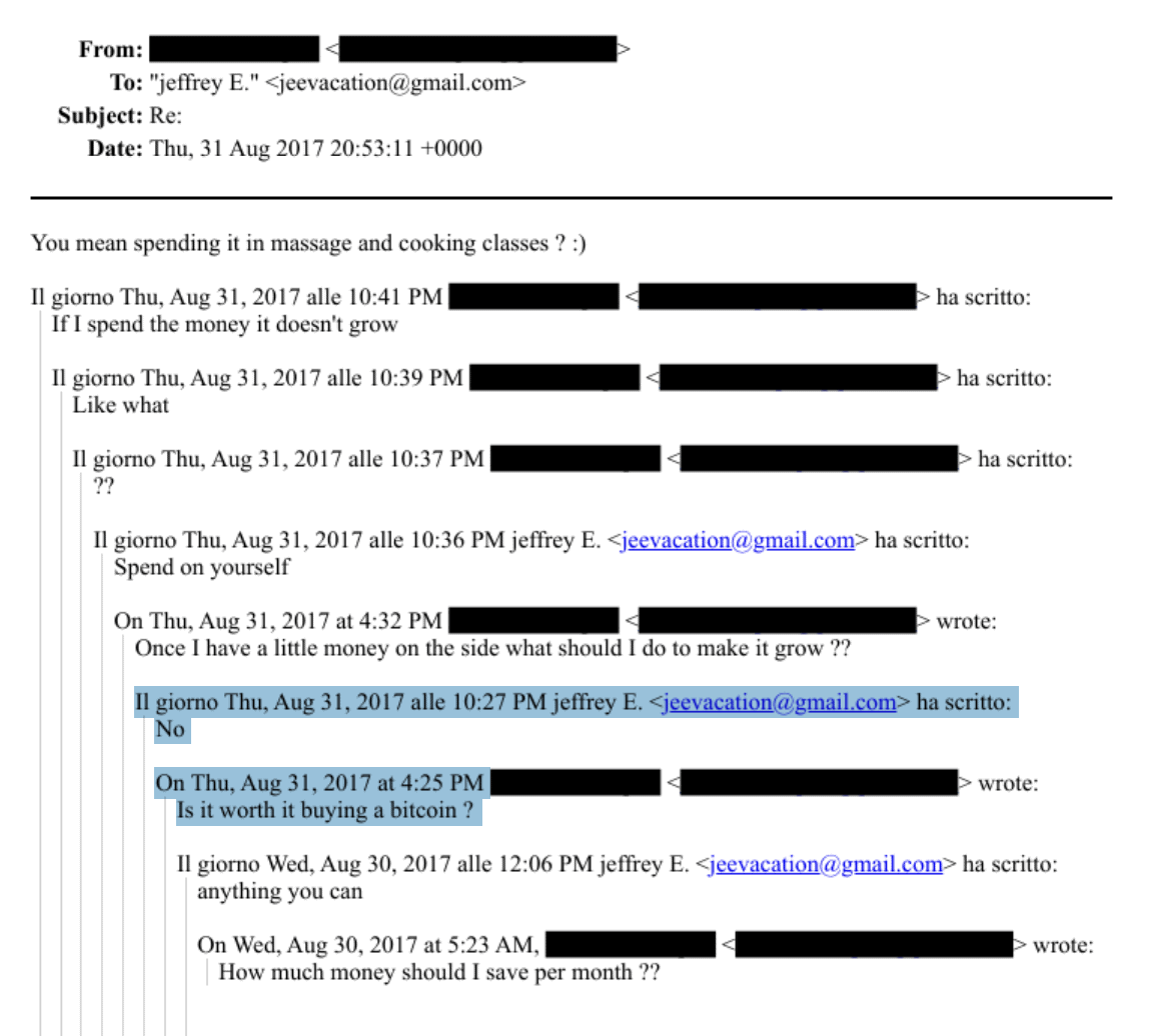 При этом его интерес был ориентирован преимущественно на краткосрочную прибыль, а не на идеологию или долгосрочное хранение. В одном из писем Эпштейн прямо отвечал отрицательно на вопрос о целесообразности покупки биткоина.