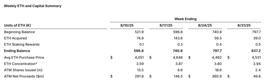 SharpLink Gaming (SBET) сообщила о покупке более $176 млн в ETH в последнюю неделю августа. Это увеличило ее общий запас до 837 230 ETH, оцененных почти в $3,6 млрд на 31 августа