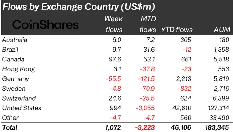 Положительную динамику также показали Канада ($97,6 млн) и Швейцария ($24,6 млн). Заметный отток средств зафиксирован в Германии ($55,5 млн).