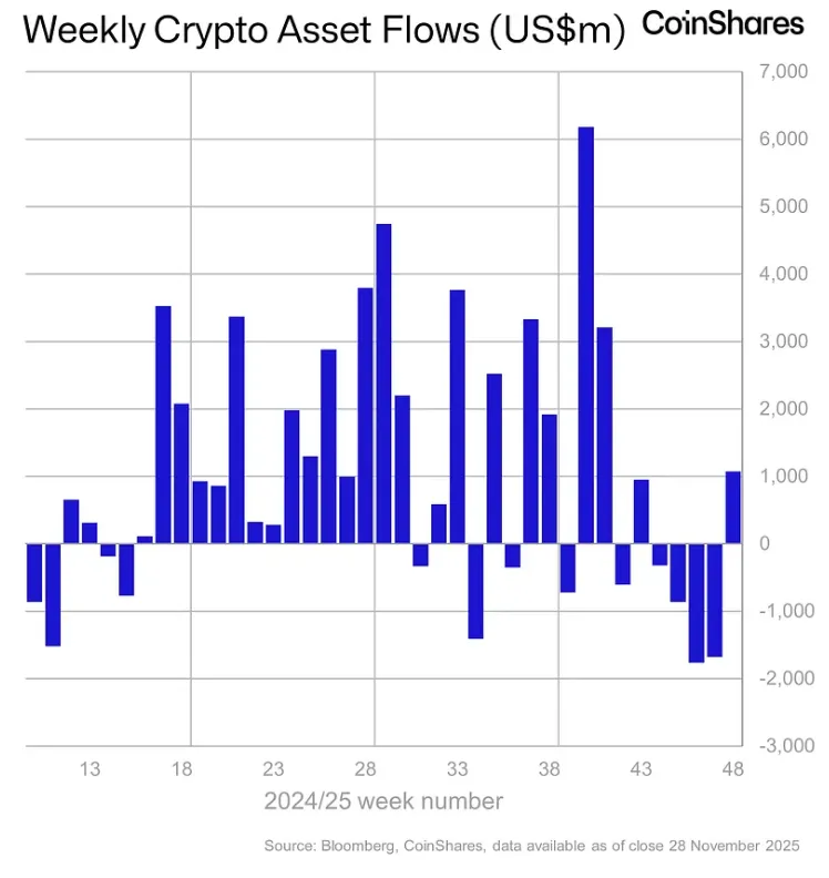 С 21 по 28 ноября поступления в криптовалютные инвестиционные продукты составили $1,07 млрд. Позитивная динамика прервала четырехнедельную серию оттоков общим объемом $5,7 млрд, говорится в отчете CoinShares.