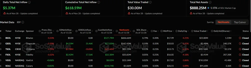 28 ноября сектор спотовых биржевых фондов на базе Solana зафиксировал чистый приток капитала в размере $5,37 млн.