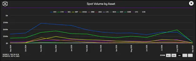 Несмотря на наметившуюся коррекцию, по отдельным показателям эфир продолжает ставить рекорды. Например, торговый объем ETH на централизованных биржах (CEX) в августе ($479,56 млрд) впервые за семь лет превзошел аналогичный показатель биткоина ($400,63 млрд). Основными драйверами этого события стали массовые формирования бизнесом резервов эфира, а также спрос на спотовые ETH-ETF.