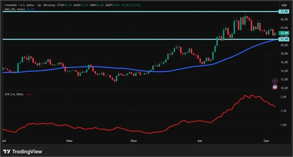С точки зрения технического анализа, тренд Chainlink — восходящий, так как цена расположена выше 50-дневной скользящей средней (отмечена синим цветом). А вот волатильность криптовалюты падает ввиду снижения индикатора ATR. Ближайшие уровни поддержки и сопротивления на дневном графике: $21,4 и $27,86 соответственно.
