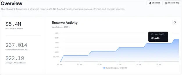 Chainlink Reserve — резерв токенов LINK пополнился еще на 43 937 коинов. Суммарно он теперь насчитывает 237 014 монет общей стоимостью $5,4 млн. Средняя цена приобретения одного LINK составляет $22,19, что всего на 2,6% ниже текущей рыночной стоимости.