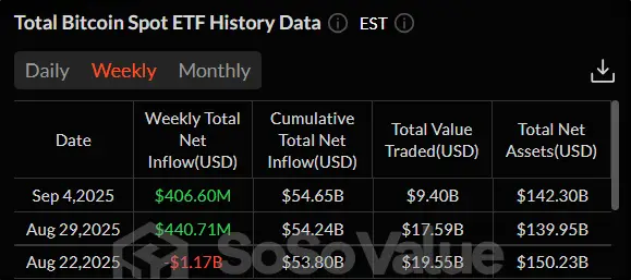 Спотовые биткоин-ETF вторую неделю подряд фиксируют приток денежных средств. На этот раз он составил $406,6 млн. Хотя показатель далек от максимальных значений 2025 года, спотовые биржевые фонды на биткоин смогли прервать шестинедельную серию, где демонстрировали худшую динамику относительно аналогичных продуктов на эфир.