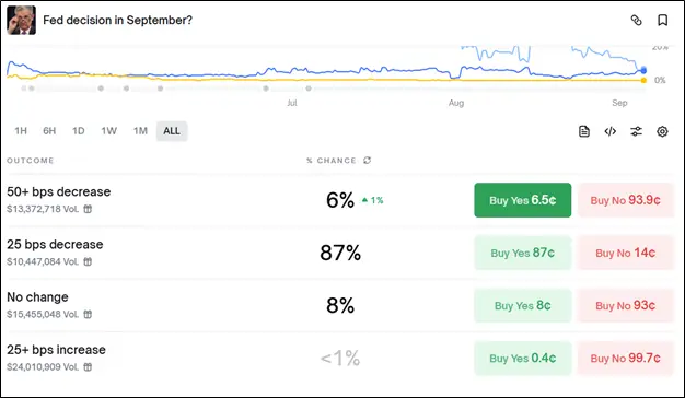С этой точкой зрения согласны и посетители платформы предсказаний Polymarket. Наиболее вероятным вариантом на заседании ФРС 17 сентября станет снижение ключевой ставки на 25 базисных пунктов, верит 87%.