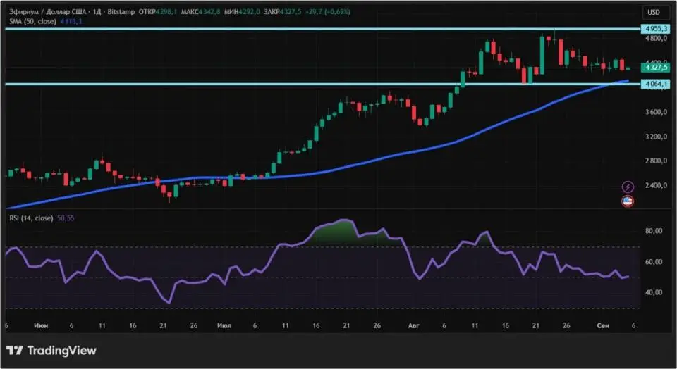С точки зрения технического анализа, долгосрочный тренд эфира остается восходящим. Это подтверждается тем, что цена по-прежнему располагается выше 50-дневной скользящей средней (обозначена синим цветом). Также из положительного можно отметить тот факт, что RSI хоть и снижается, но остается выше значения 50. Текущие уровни поддержки и сопротивления по дневному графику: $4064,1 и $4955,3 соответственно.