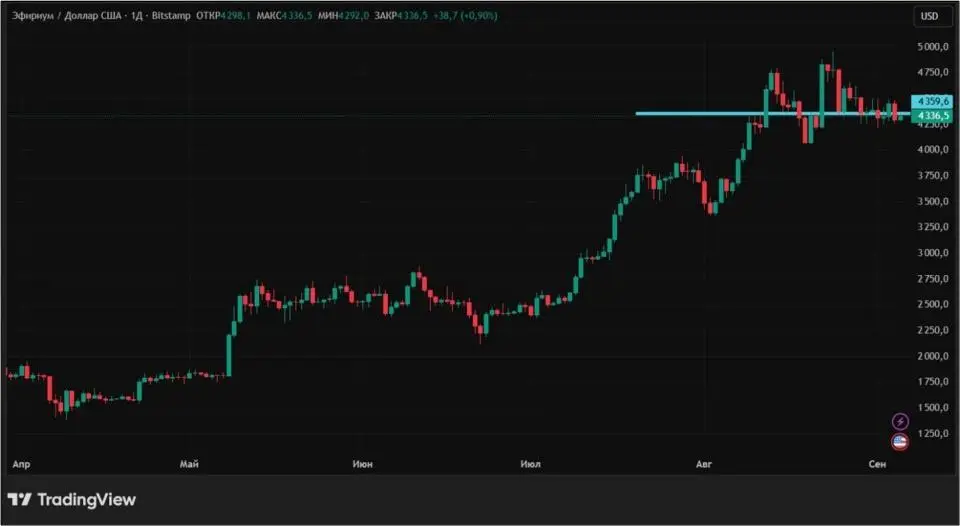 Эфир с 29 августа по 5 сентября продемонстрировал околонулевую динамику. Цена застыла чуть выше отметки $4300. Пять из семи торговых сессий завершились для ETH в плюсе. Тем не менее, максимальный ценовой рост по итогам дня ни разу не достиг даже 3%.