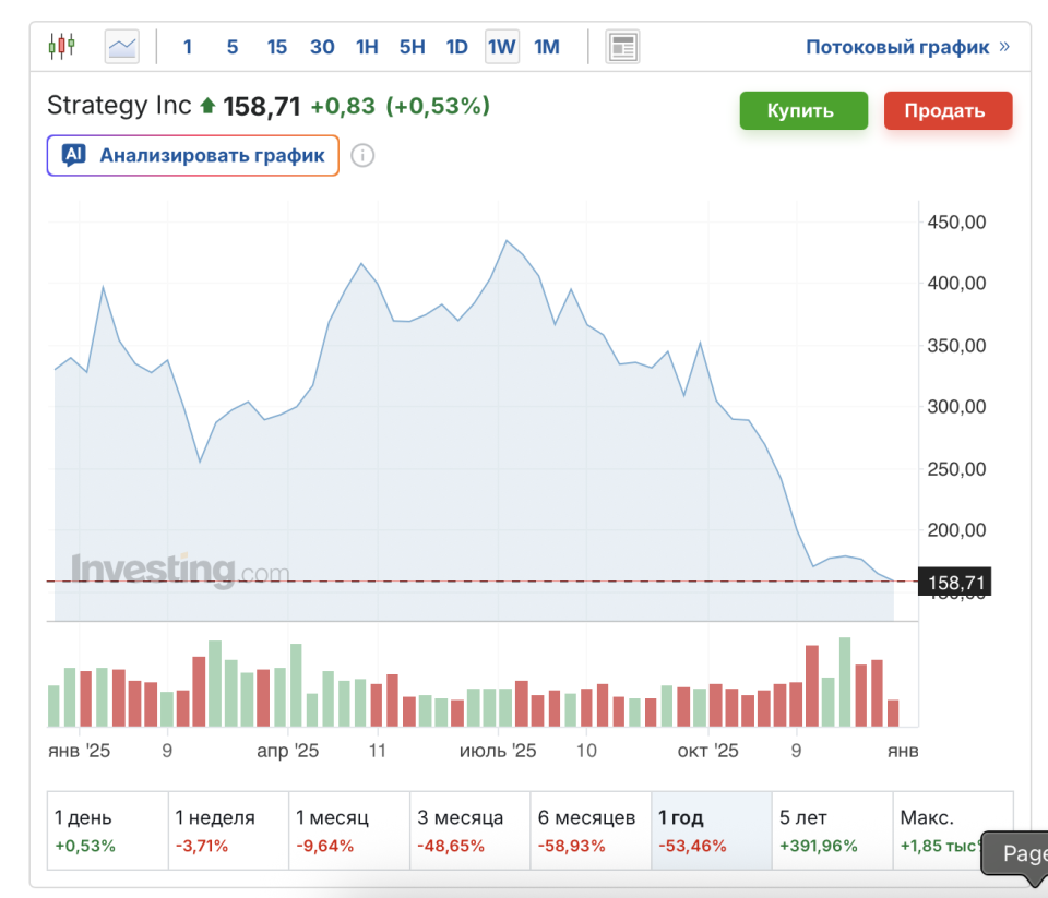 В декабре 2025 года акции Strategy достигли годового минимума — $155. 26 декабря бумаги компании торговались у отметки $158–159. Падение за год составило более 53%.