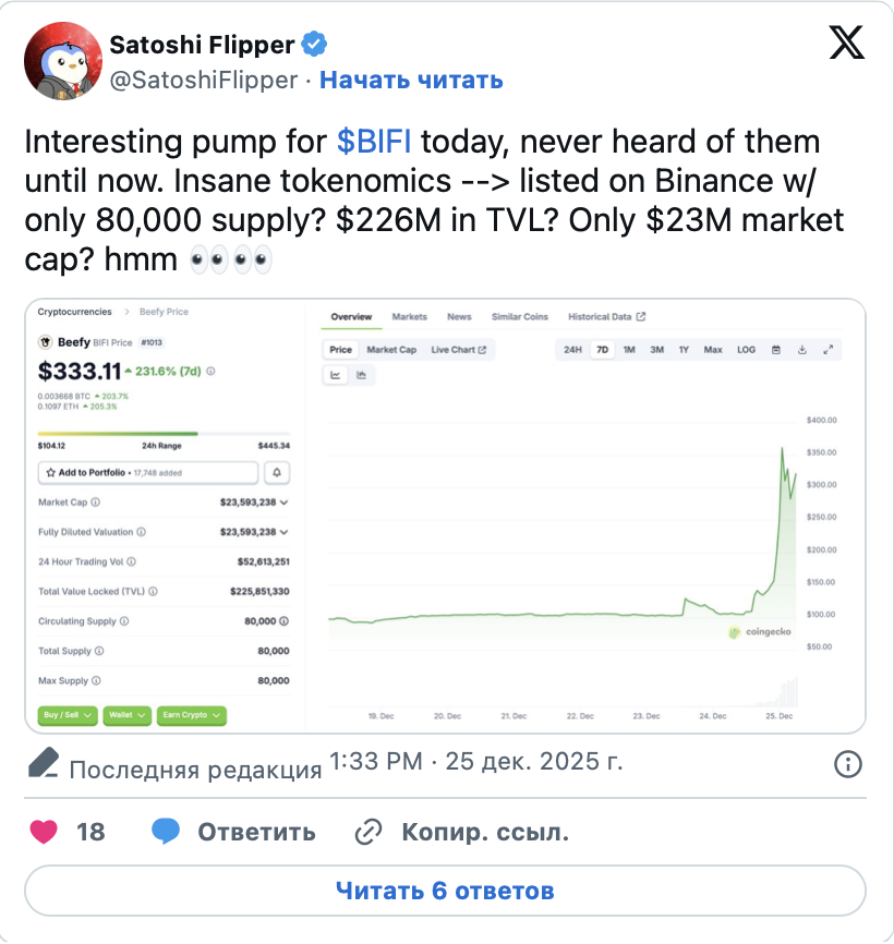 Это движение вывело BIFI в лидеры роста на всем криптовалютном рынке 25 декабря. Примечательно, что скачок произошел при отсутствии громких анонсов со стороны разработчиков протокола или системных сбоев в экосистеме.