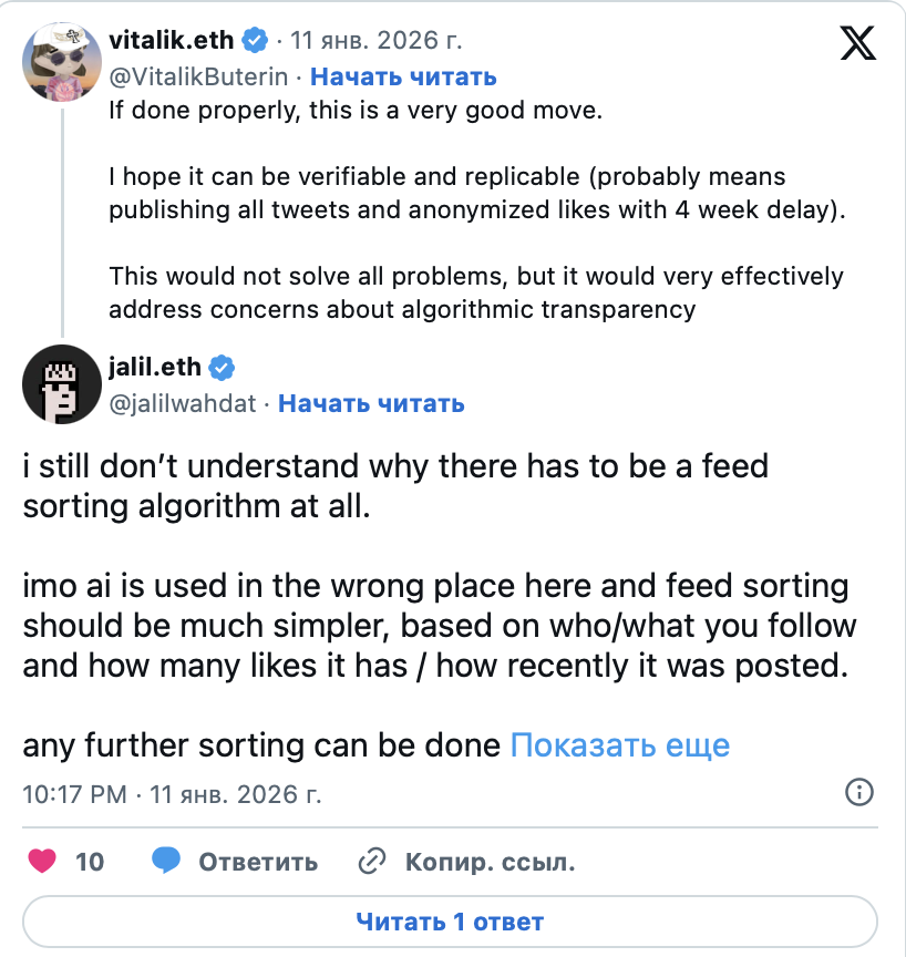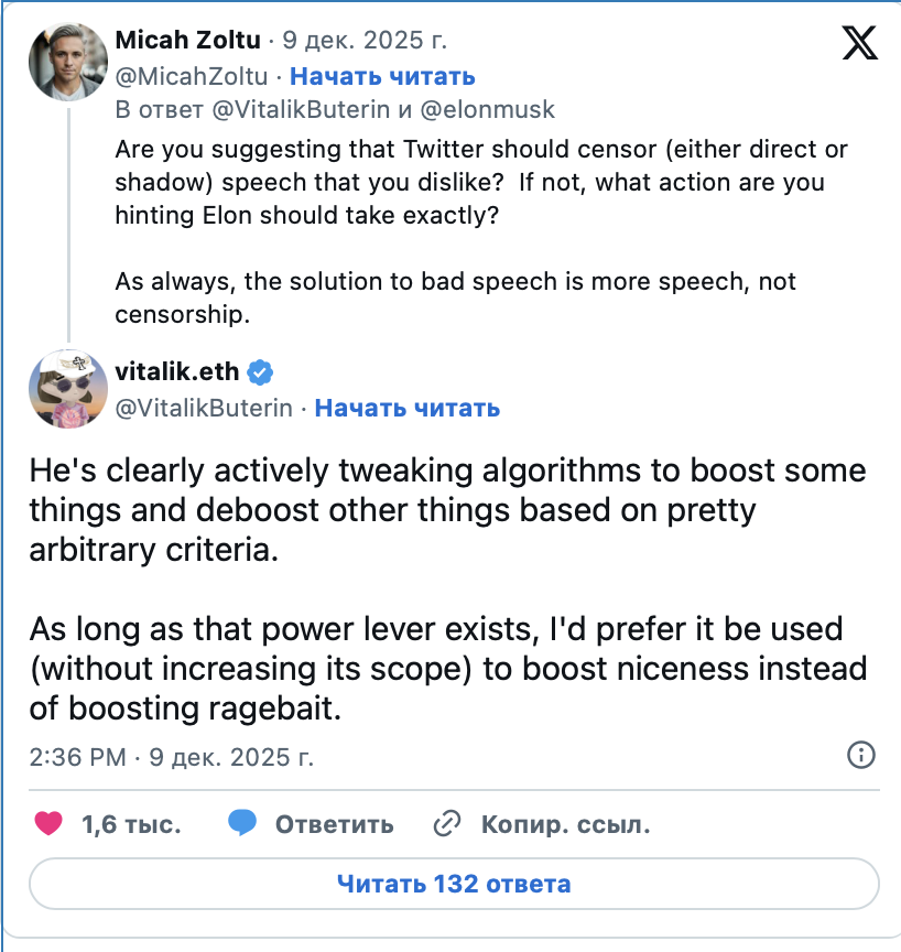 Обсуждение стало еще одним этапом давнего диалога между Илоном Маском и Виталиком Бутериным. Ранее Бутерин уже критиковал механику продвижения публикаций в X, указывая на опасность алгоритмов, провоцирующих агрессию либо блокирующих контент без ясных причин, хотя сам отмечал стремление Маска отстаивать свободу слова.