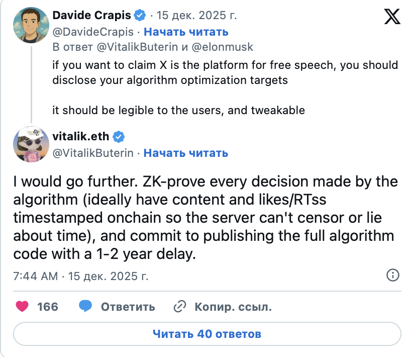Он также предлагал использовать zk-доказательства для объяснения решений алгоритмов и отмечать публикации ончейн-метками времени, чтобы избежать цензуры на стороне серверов. По словам Бутерина, такие меры помогут вернуть доверие и сделать площадку более ответственной перед пользователями.