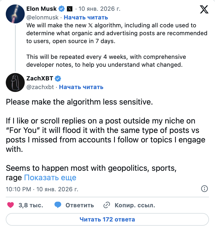 «Открытые алгоритмы полезны для разработчиков. Пользователи видят уже распределение контента», — написали они. — «Прозрачная система должна давать каждому понять три вещи без догадок: рассмотрели ли мой контент, какие сигналы ключевые и где я теряю показы — и по какой причине».