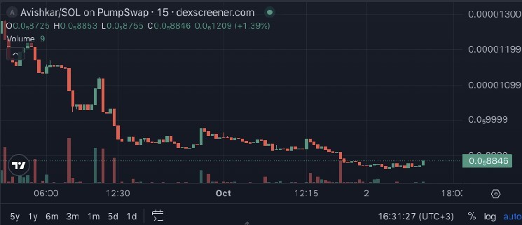 Запущенный в конце сентября $Avishkar позиционировался как социально значимая монета, сочетающая активизм и криптовалюту. Однако уже через несколько часов после запуска ликвидность исчезла, и цена токена резко упала. На момент публикации пара Avishkar/SOL торговалась около $0,875 при небольшом объёме торгов, сопротивление достигало $0,90–$0,92, а психологический барьер находился на уровне $1,00.