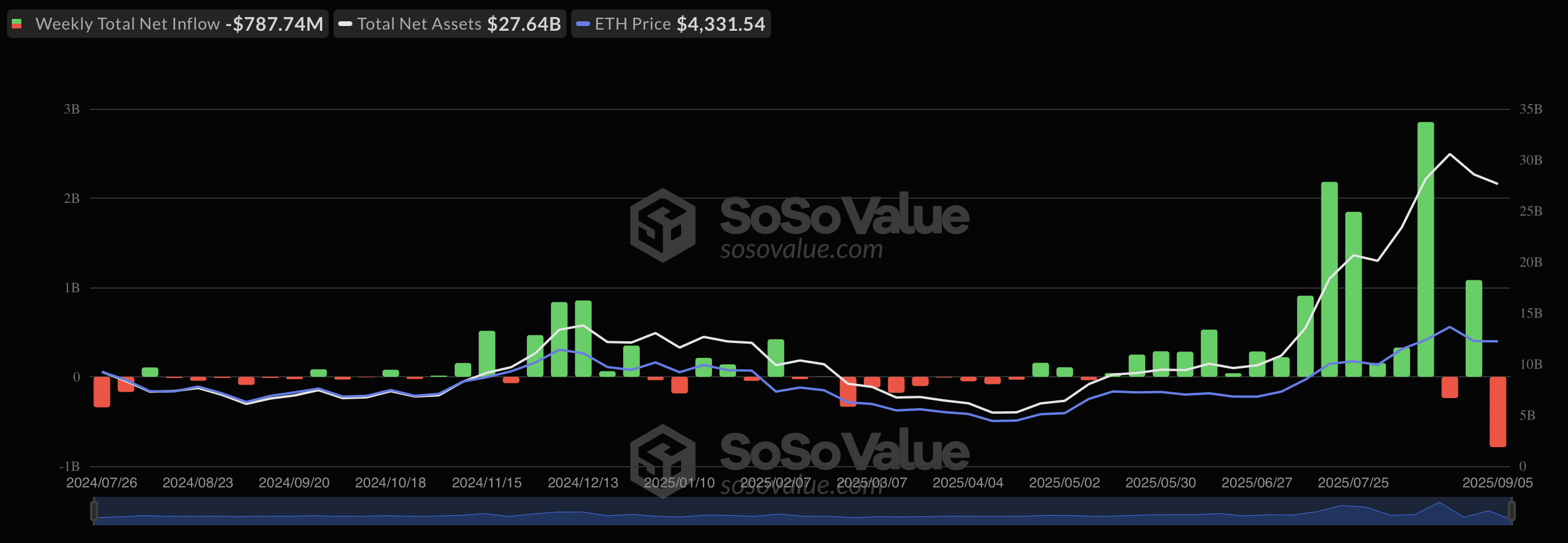 В период с 1 по 5 сентября 2025 года биржевые фонды на базе Ethereum потеряли средства, сумма которых составила $787,74 млн, по данным SoSoValue. Это уже вторая зафиксированная неделя негативной динамики в сегменте с середины мая.