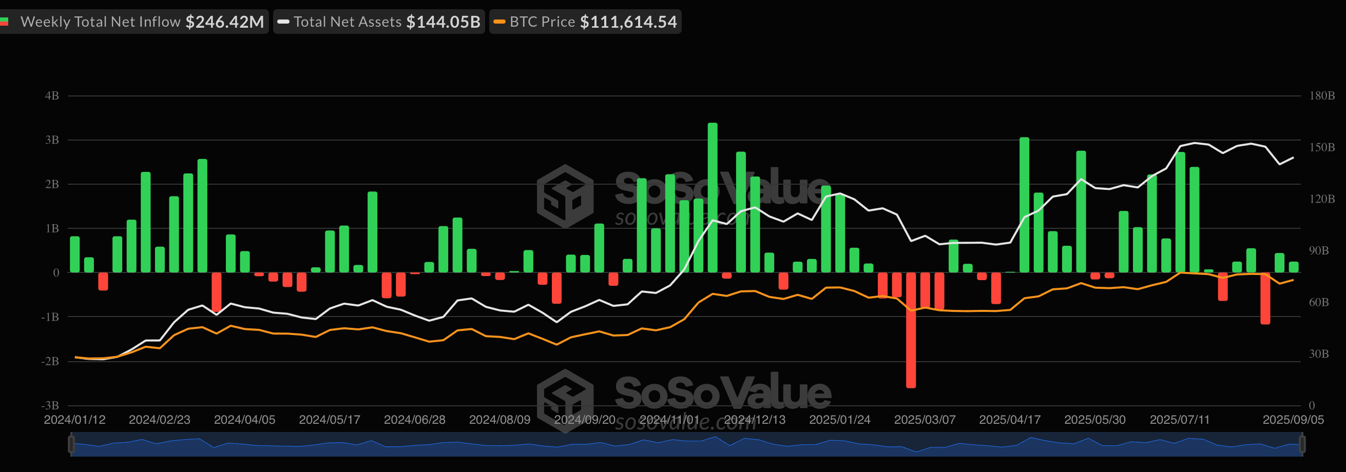 Сектор спотовых биткоин-ETF зафиксировал приток инвестиций на сумму $246,42 млн, согласно данным SoSoValue.